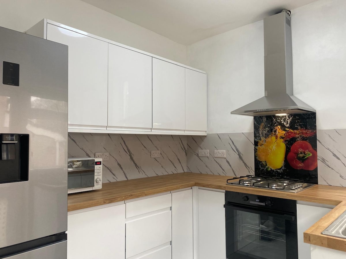 Bienvenido a esta moderna y lujosa casa de 4 dormitorios diseñada para familias y grupos que buscan espacio, comodidad y conveniencia. Disfruta de una amplia sala de estar con Smart TV de 65 pulgadas, Netflix y wifi rápido, ideal para relajarte después de un día en la ciudad. El alojamiento ofrece 2 camas tamaño king, 2 camas dobles, 3 baños, incluido uno en suite, y una luminosa cocina americana y comedor. Los huéspedes también tienen acceso a un aparcamiento en la calle (10 £/día). Bien situado cerca de la estación de autobuses de East Ham, tiendas locales, cafeterías.