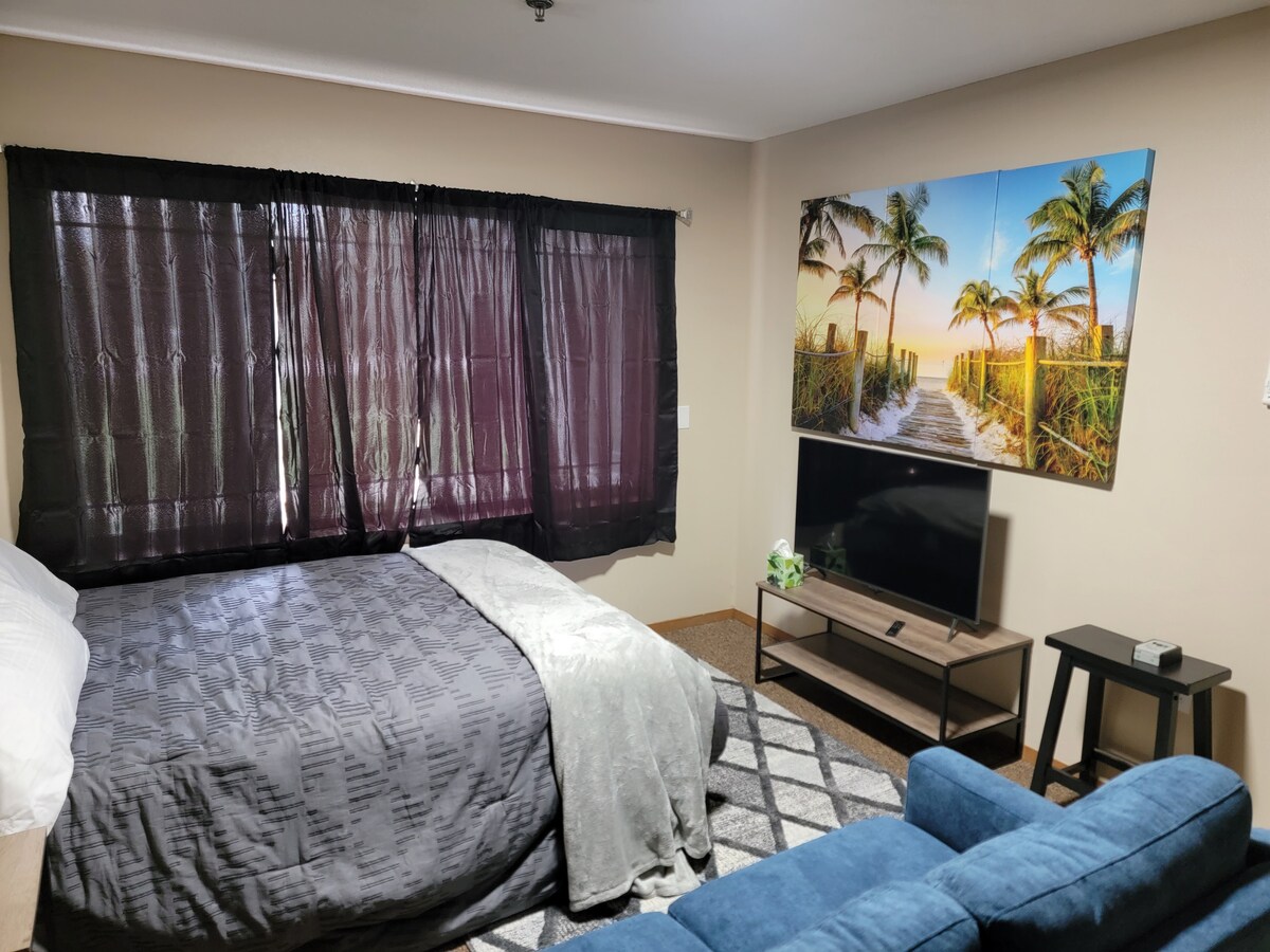 Aléjate del ajetreo a las afueras de Sioux Falls. Un apartamento privado completo en una casa nueva en un barrio rural. Plaza de aparcamiento y pasarela privada a una entrada independiente en el nivel inferior. Relájate con una cama tamaño king ajustable y caliéntate con una ducha de vapor para dos. Cocina completa, sala de estar con futón, sin alfombras, cemento pulido con calefacción en el suelo, aire acondicionado central y ventiladores de techo, patio trasero arbolado. Parque Estatal Good Earth a 1/2 milla, Dntn Sioux Falls a 10 millas, I-90 a 10 millas.