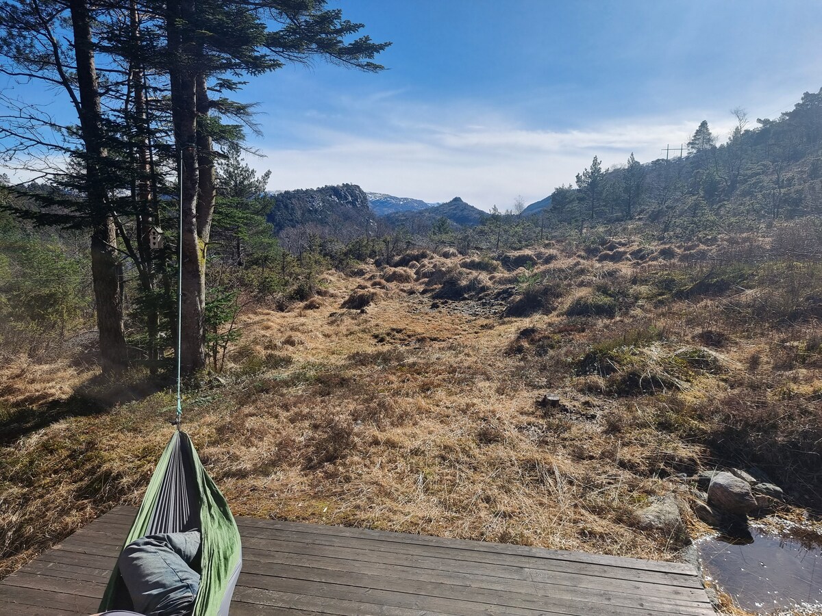 Lee el anuncio completo. En el lago hay excelentes oportunidades para nadar, pescar y hacer senderismo. La carretera no sube hasta arriba, por lo que tienes que caminar unos 15 minutos hasta la cabaña. Hay paneles solares, sistema de 12 voltios para iluminación, carga, TV con reproductor de DVD para relajarse con una película por la noche. Nevera y cocina de gas. Pesca truchas y salvelinos en el agua o camina por la montaña hasta el centro de Bergen, disfruta de una bebida helada en el muelle y coge el autobús de vuelta por la noche. Es mejor si ya tienes algo de experiencia en la vida al aire libre.