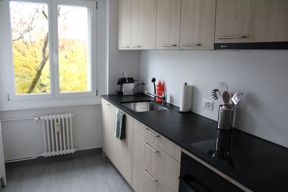 Cómodo apartamento de 2 habitaciones con mucho ambiente y unas vistas fenomenales de los Alpes. A unos 10 minutos a pie de la estación de tren. El centro de Berna está a 15 minutos en tren. Hermosa zona de recreo justo en la puerta de la casa. Un paraíso para paseantes, corredores, ciclistas, nadadores o patinadores. El apartamento está en el ático con acceso por ascensor. Aparcamiento en la puerta. Los anfitriones viven en la casa y están encantados de ayudar y aconsejar.