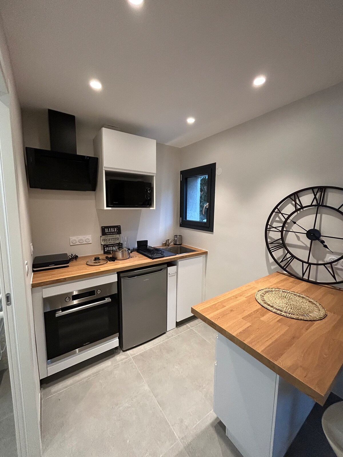 Estudio independiente de nuestra casa. Se entra por la sala de estar con ventanal que ofrece una hermosa claridad y está equipada con cortinas opacas para obtener la oscuridad deseada. Bonita terraza de madera, protegida. Cocina equipada: fogones, campana extractora, horno, nevera, microondas, cafetera, hervidor de agua. Habitación cama doble, armario, bloque de almacenamiento. Cuarto de baño con ducha/lavabo/inodoro. Plaza de aparcamiento y acceso a la puerta dedicada.