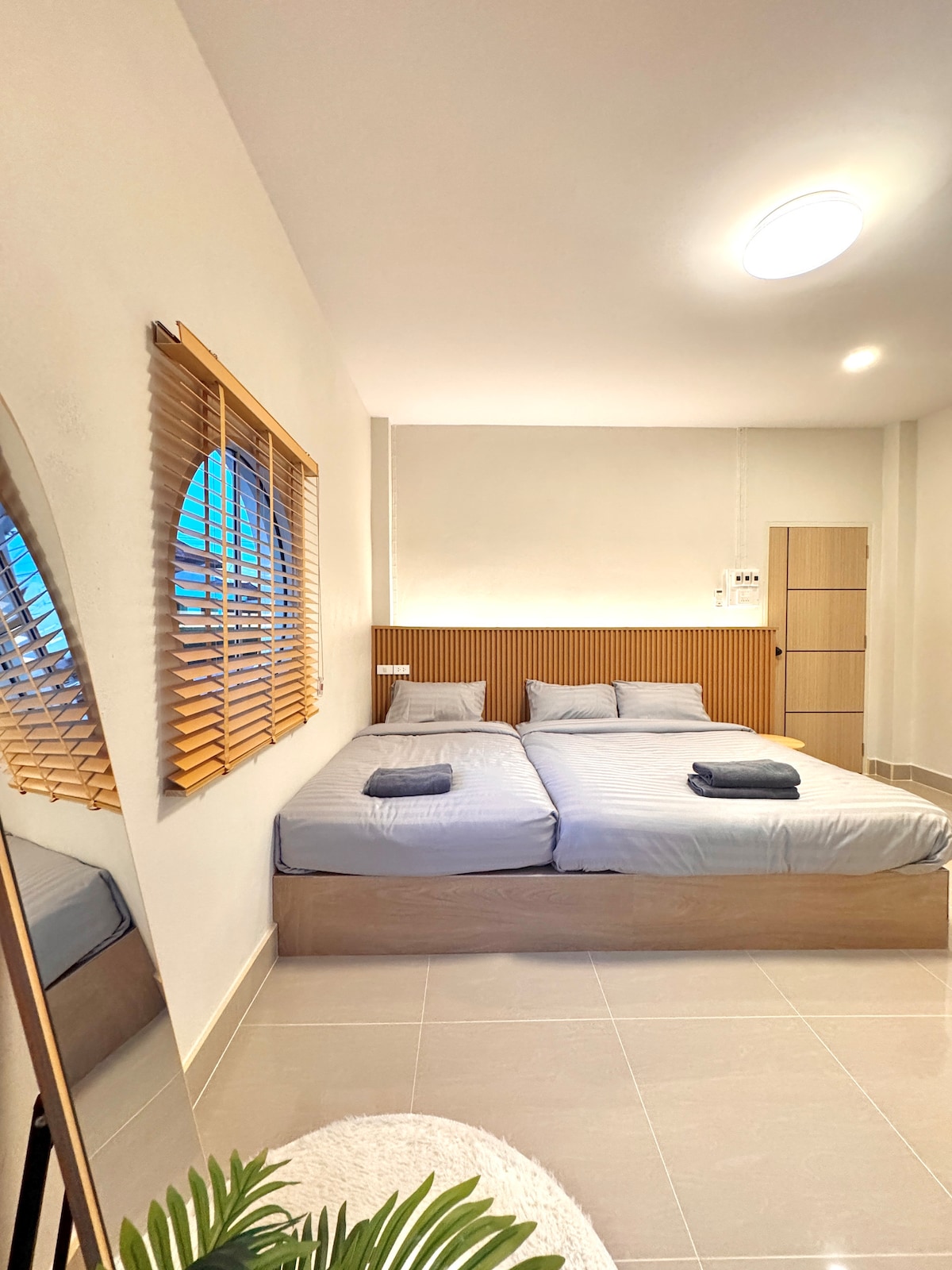 Alojamiento en la ciudad de Betong, Yala, ofrece un acogedor y nuevo dormitorio moderno, 1 baño, 1 sala de estar/1 cama tamaño king, 1 colchón en el suelo y 1 sofá cama