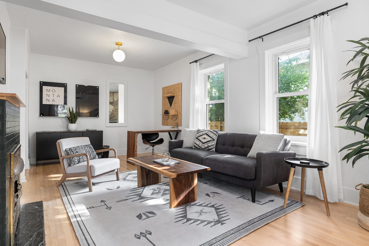 Ubicada en el primer distrito histórico residencial de la ciudad, esta casa única y moderna está a pocas manzanas de 2 hospitales importantes, la MSU y el centro de la ciudad. Elige entre desayunar en tu cocina gourmet totalmente abastecida o dar un paseo de 2 manzanas hasta el favorito local, Black Dog Coffee Cafe. Después, asegúrate de encontrar las raquetas de tenis, herraduras, frisbees de disco volador y trineos escondidos que se proporcionan para que los disfrutes en el icónico Pioneer Park, ¡a solo unos metros de tu puerta principal! Te encantará vivir Billings como un habitante más.