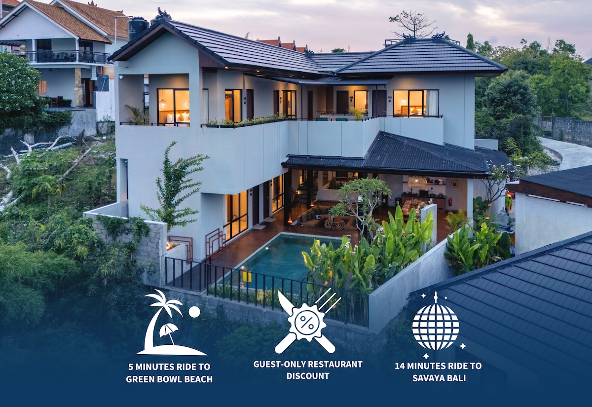 Descubre una casa de invitados en la ladera de Ungasan, donde los tejados de tejas rojas y los detalles de madera tallada reflejan el patrimonio de Bali. Cada habitación se abre a verdes céspedes y un porche para el café de la mañana, mientras que una cocina privada mantiene las comidas fáciles a mano. La piscina compartida se extiende hacia el horizonte y refleja la luz del amanecer sobre los tejados. En el interior, el aire acondicionado, las sábanas frescas y las comodidades sencillas crean un espacio acogedor, diseñado por Bukit Vista para viajeros que quieren el encanto de Bali a su alcance.