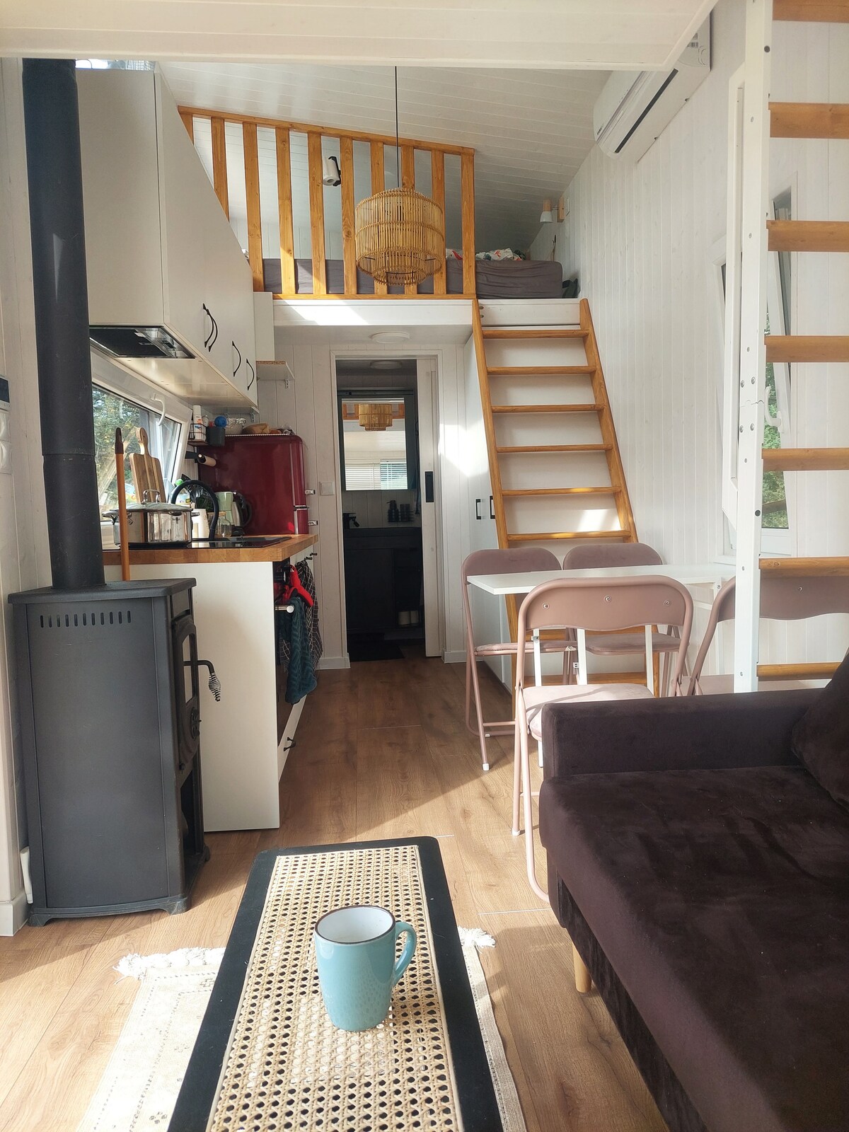 Vivís en una casa de madera independiente separada del resto del patio. Naturaleza pura. Desde la terraza se tiene una gran vista del paisaje montañoso y de prados. Allí también se puede disfrutar de las puestas de sol. El patio está a 25 m, donde también se puede utilizar el invernadero y el bar, así como la terraza del lago. La casa se calienta con una estufa de leña, que también abastece el piso superior a través de corrientes de aire. Para ello, hay que encender la chimenea.