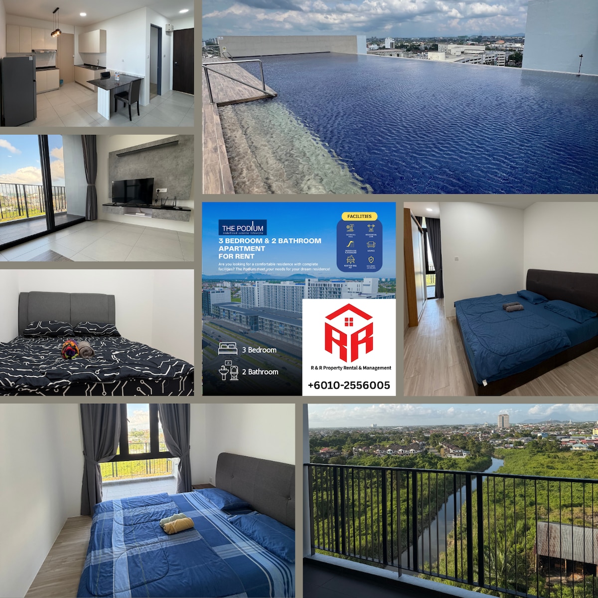Apartamento de 3 dormitorios en The Podium, Kuching Moderna y espaciosa unidad con 1 baño privado y 2 habitaciones adicionales que comparten un baño. Ideal para familias o viajes de negocios. Zona de restauración y tienda en la planta baja Cerca de los hospitales KPJ y Timberland A 5 minutos de AEON, a 10 minutos del aeropuerto Aparcamiento gratuito | Aire acondicionado | Wifi ¡Alójate en R&R para disfrutar de comodidad, privacidad y comodidad!