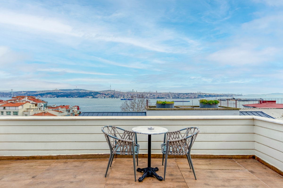 Esta elegante, bien decorada (todos los muebles de madera están hechos a mano), impecablemente limpia, grande y única suite tiene un baño de alta calidad y ascensor en la excelente ubicación en el distrito de Beyoğlu/Taksim. Además, desde su balcón privado se puede ver la magnífica vista panorámica del Bósforo (hasta las Islas Príncipe y el lado asiático) y la península histórica (palacio de Topkapi, Santa Sofía, mezquita de Süleymaniye, torre de Gálata, junto con otros monumentos famososos).