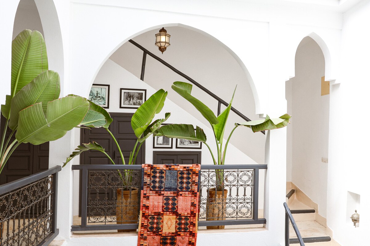 Bienvenue au Trèfle blanc Poussez la porte blanche et découvrez mon amour du Maroc. Entièrement rénové, Je voulais une ambiance conviviale et paisible . j'ai privilégié le côté authentique et une décoration, simple et élégante. Artisanat marocain, objets, meubles vintage… Idéalement placé, à quelques minutes à pieds des sites tels que Majorelle, le musée Yves St Laurent, Dar Bacha ou l'incontournable Place Jamel El Fna Petit déjeuner complet est compris. Au plaisir de vous accueillir Sophia