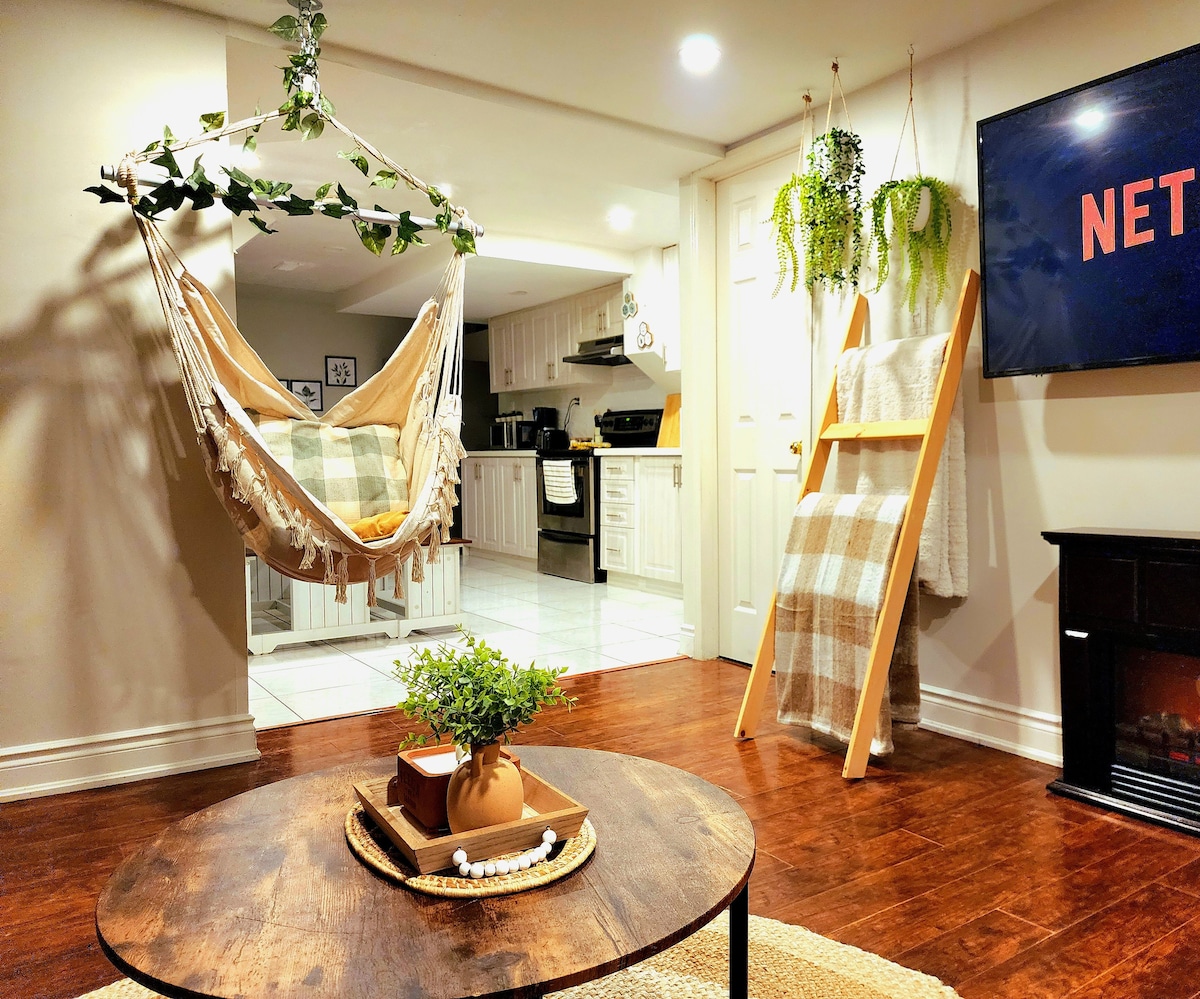Welcome to your little cozy cottage getaway! This charming 2-bedroom basement unit has its own private-seperate entrance, and everything you need to unwind, including a cozy swing in the living room! Great spot to curl up with your favorite book, watch TV, or simply socialize with your favorite people! Its equipped with all the amenities you need for a comfortable and relaxing stay. Check-in is after 4pm.