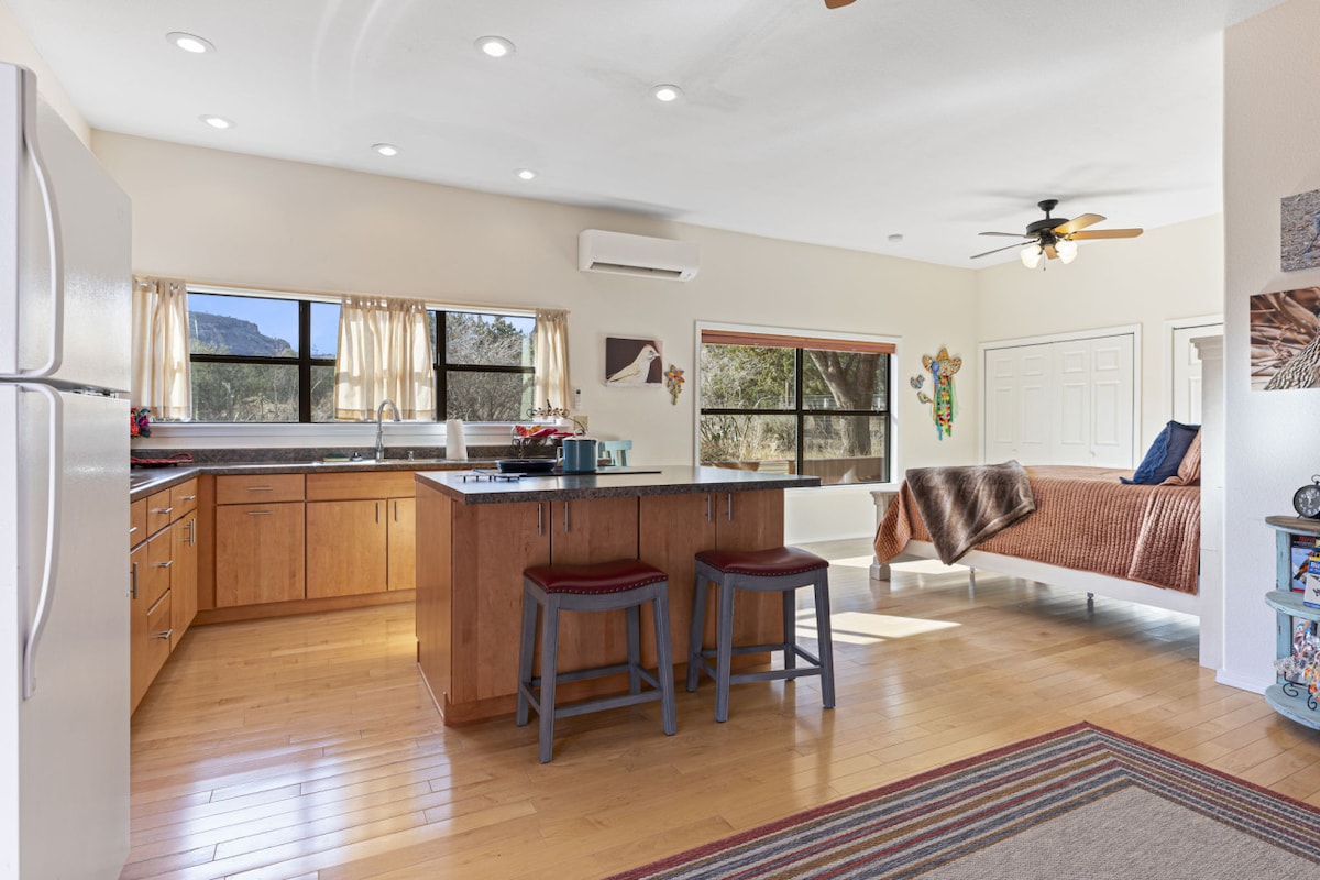 Enjoy this 360 sq ft casita with a covered patio, fully fenced private yard, & comfortable inside quarters. The casita features a kitchenette with an electric stove top, microwave, coffee maker, and mini fridge, as well as internet, smart TV w/ Roku, mini-spit AC & heating unit, Cal King bed with a foam mattress, & a bathroom with a shower. Located within walking distance to SRSU, restaurants, shops and more. Keyless entry. Pet friendly - $20 flat fee per pet (max 2 pets).