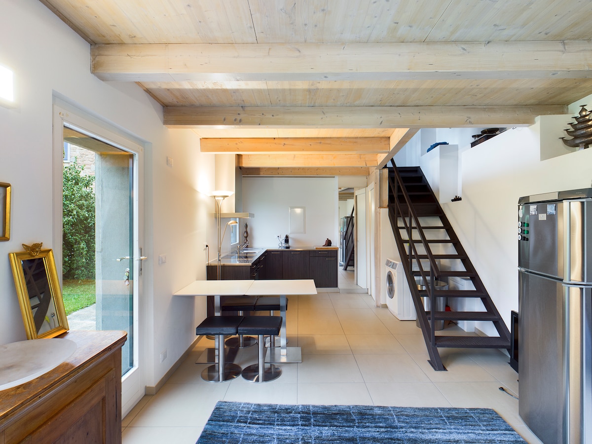 Ciao al «Rustico Boltini», una elegante casa diminuta situada en una zona tranquila junto al bosque, a solo 8 km del lago Maggiore. Esta casa, diseñada con mucho cariño, ofrece en sus 40 m² una zona diurna y de descanso diáfana con una impresionante altura de techo hasta el tejado. Los materiales cálidos, como el elegante parqué de roble silvestre, combinados con equipamientos modernos como la bomba de calor y la estufa de pellets, garantizan un ambiente acogedor en cualquier época del año.