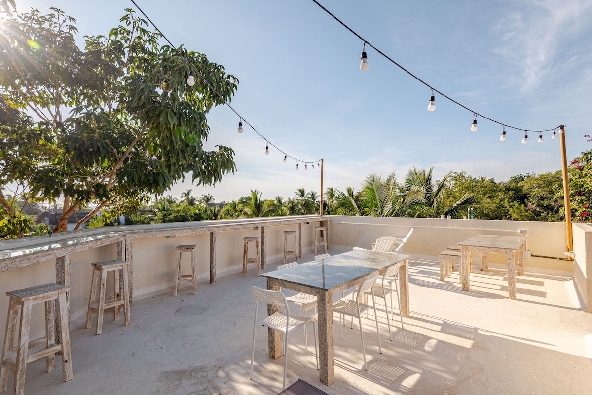 Depa amplio y luminoso en planta alta con 2 camas queen súper cómodas, A/C en la recámara y ventiladores en sala y cocina. Cuenta con cocina equipada, salita acogedora y balcón con vista a palmeras. Estás a solo 2 min de la playa y a 1 min de cafés, tiendas y restaurantes. Disfruta el patio compartido con hamacas, árboles frutales, asador y área de pesas artesanales. Ideal para relajarte, surfear o trabajar remoto con buena vibra.