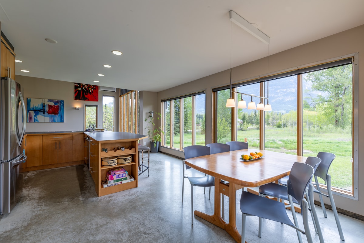 MOONRAKER MOUNTAIN MöKKI (palabra finlandesa que significa cabaña) - Jacuzzi para 7 personas - fogata al aire libre - Sala multimedia con pantalla de proyector/Netflix. - Cubierta de 500 pies/sala con calefacción. - chimenea de leña - Barbacoa cubierta - 100 km de campos, bosques y senderos fluviales a la vuelta de la esquina. - Juegos de interior/exterior - Alquiler de SURF de remo/canoa, paravelismo a 1 km. - A 25 minutos del centro vacacional Kicking Horse. - senderos cercanos de trineo/quad, golf, Skybridge, rafting en el río, lobos, escalada, golf de disco, restaurantes. - Claire y Matt viven al lado del mökki.