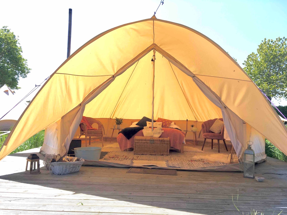 Furnished bell tent with wood burner & camp fire