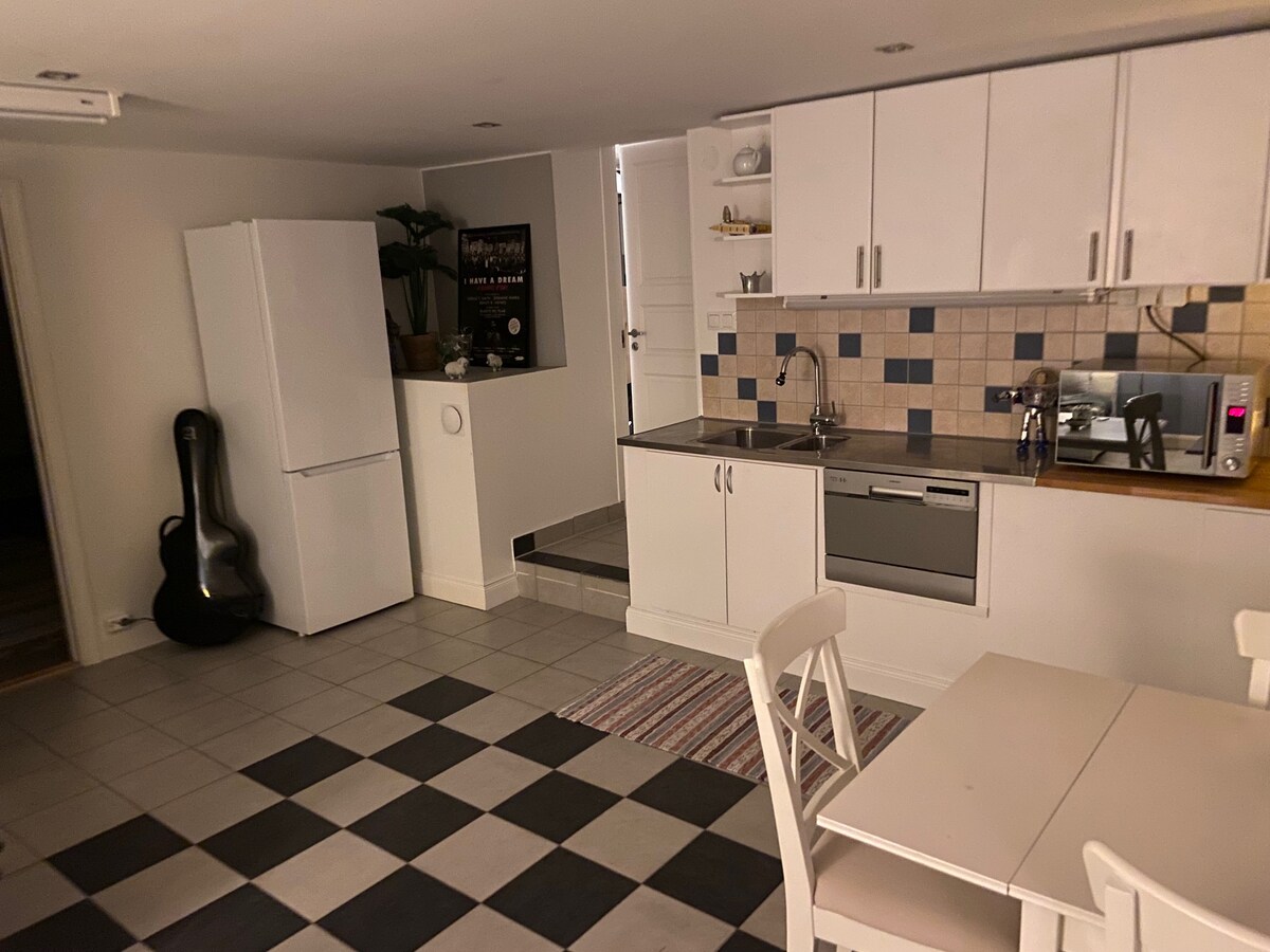 Villa apartamento de 47 metros cuadrados en un bonito entorno de jardín. Entrada privada a un amplio salón con sofá, TV grande y cómoda cama doble/sofá cama. En la cocina hay espacio para 4 personas, nevera/congelador, estufa de inducción, horno/microondas. El departamento tiene un baño de lujo con ducha. En los alrededores hay oportunidades para paseos encantadores a lo largo del lago Mälaren. En el jardín soleado se puede desayunar y en otoño recoger las manzanas. A la ciudad de Estocolmo - Coche: 8 min, tren: 19 min, bicicleta: 30 min.