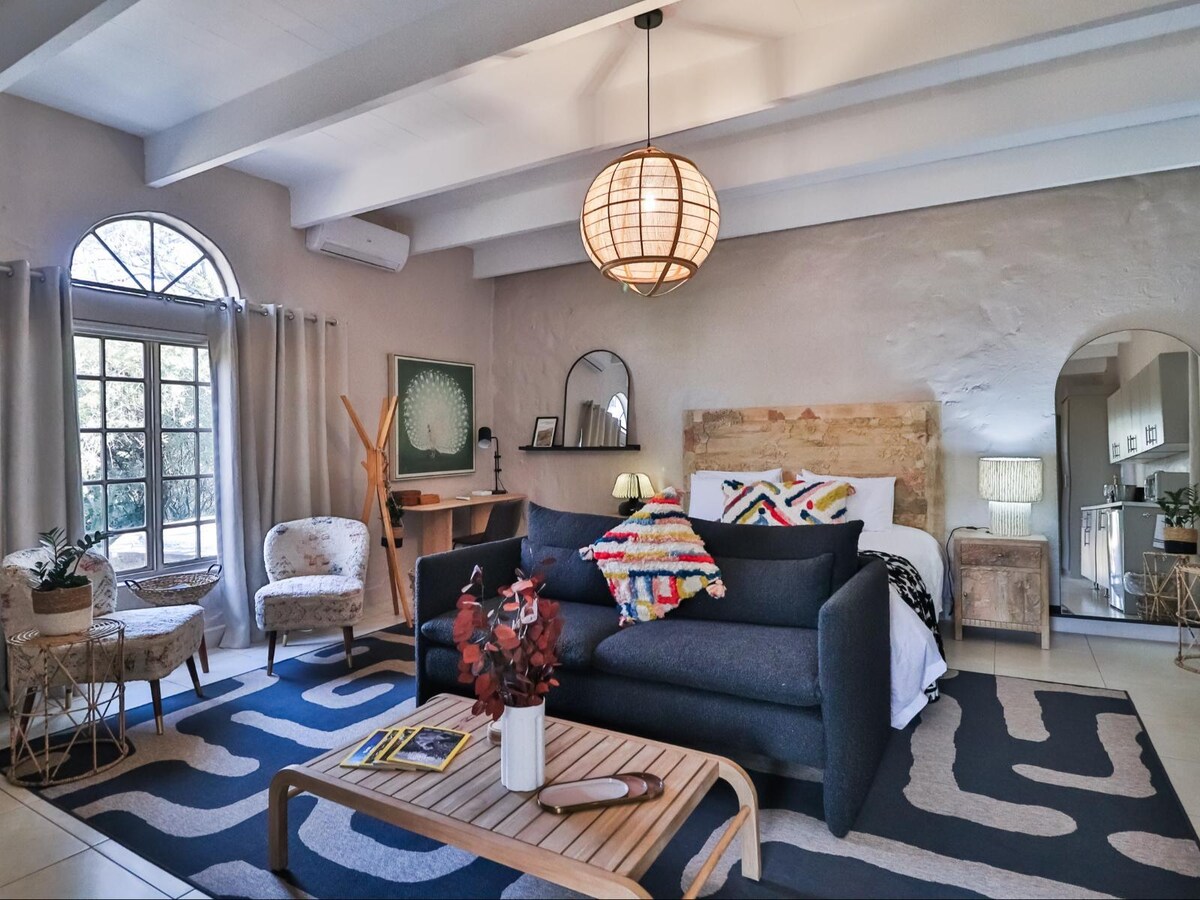 Private cottage located on 1 hectare small holding bordering private reserve with hiking & mountain biking trails. The tranquil setting creates a feeling of being on a farm despite being on the outskirts of the city. Expansive garden with pool, braai area and stoep with fire place to relax & de-stress. 10 mins to N1 & N4 highways. 5-10 mins to hospitals, shopping centres, gym and restaurants. Live music and dancing? We are 10min from Padstal and 3 min from Landje.