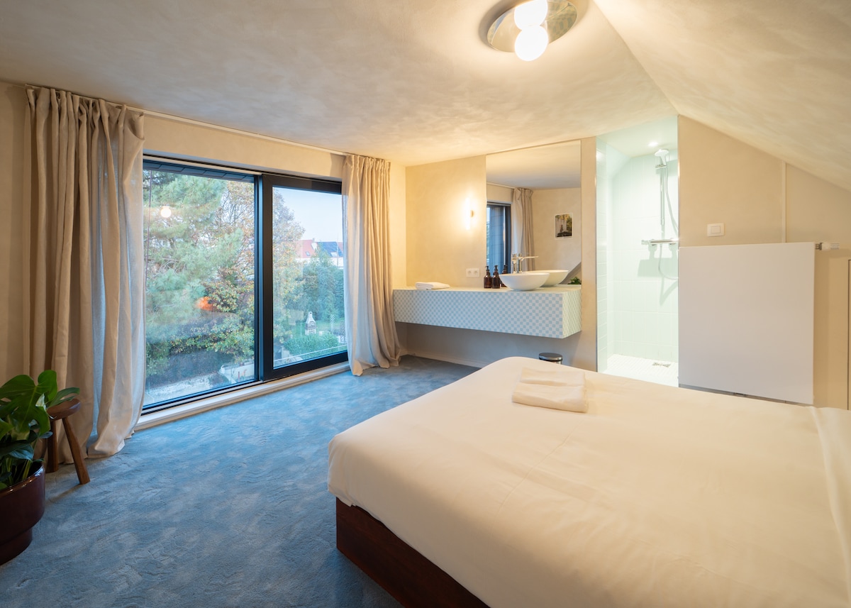 Inspiring annexe in urban jungle in the heart of the lively Dansaert neighbourhood. On stepping stones, you walk an adventurous path up to the annexe. It includes a completely private and quiet bed- and bathroom. These overlook an urban jungle. The bed is a very comfortable Auping double bed (180/200). There is a little lounge with 2 armchairs + projector (Netflix). The connecting bathroom is equipped with a walk-in shower, sink and toilet. No: pets, smoking , parties, photo shoots