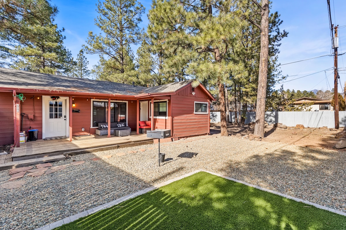 Joya oculta de dos dormitorios y un baño en los altos pinos cerca de las tiendas y restaurantes históricos del centro de Flagstaff, NAU, Ruta 66, parques y rutas de senderismo. Electrodomésticos retro mejorados, calefacción central y aire acondicionado, patio totalmente vallado con muebles de exterior, porche delantero, barbacoa, sillas Adirondack, chimenea y mesa de picnic. Sofá de sala de estar y sillones. Una cama tamaño king y una cama queen. SmartTV en la sala de estar y dormitorios con wifi rápido de 1 gig. Lavadora/secadora de tamaño completo. Estacionamiento para 2 autos. Se admiten perros.