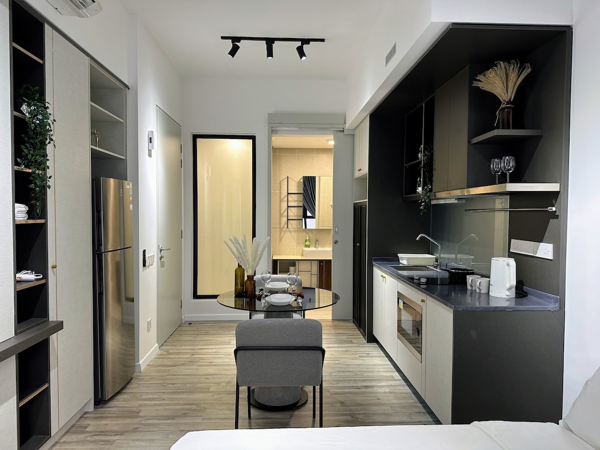 ¡Te damos la bienvenida a Revo Bukit Jalil! ¡Un moderno apartamento estudio con un diseño acogedor! * Actualizado a la combinación de lavadora y secadora 2 en 1. - 1 cama tamaño queen. - 1 aparcamiento gratuito. - Piscina en la azotea. - Justo al lado de Pavilion Bukit Jalil, a 30 segundos a pie de la entrada del pabellón. - Cerca del estadio Bukit Jalil (perfecto para que te quedes después de ver un concierto u otros eventos). - Internet de alta velocidad. - Netflix disponible. - Sábanas blancas. - Agua de ducha caliente de alta presión.