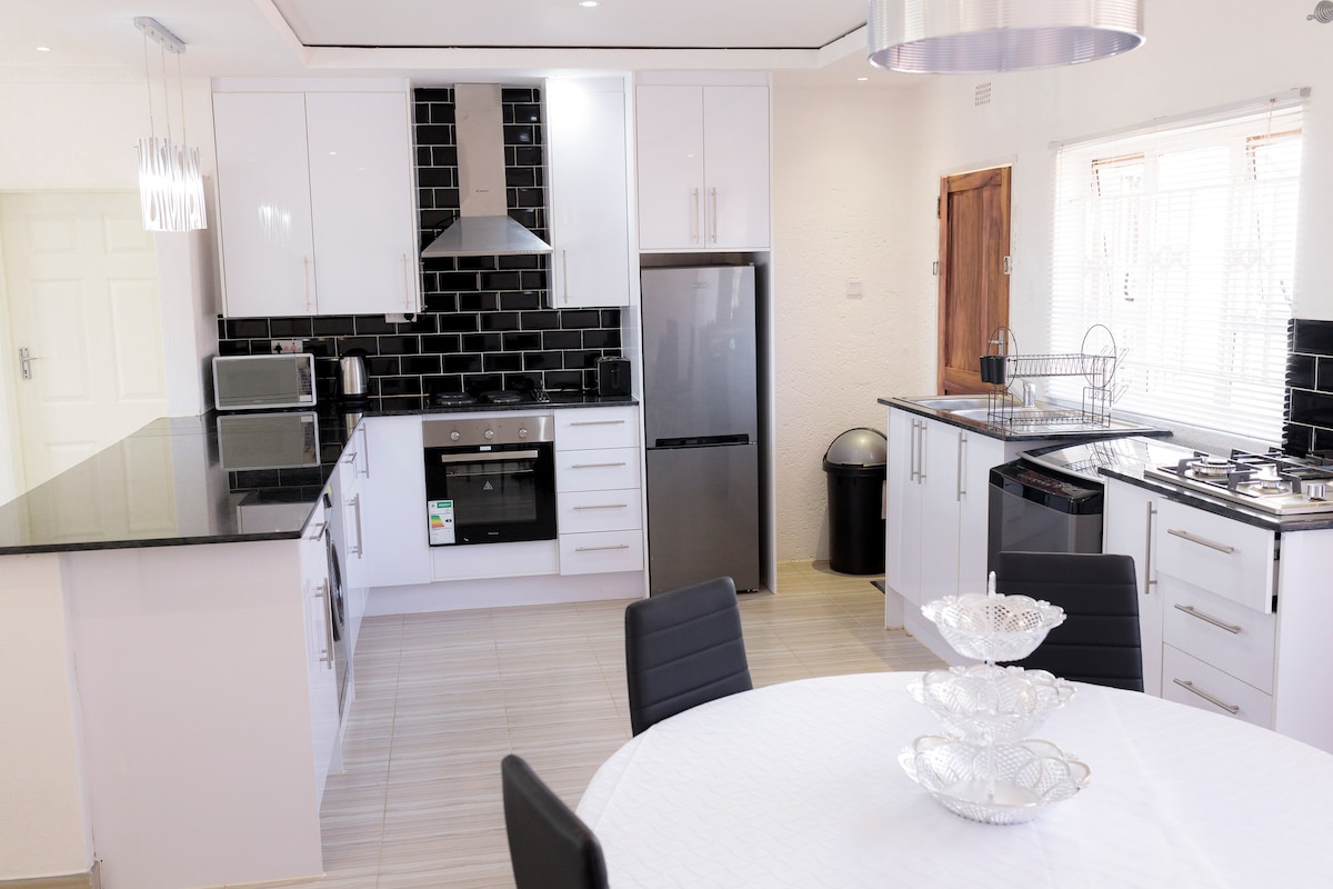 NovaNest: recarga las pilas con comodidad Baño privado tamaño king 🛏️ Brasero al aire libre 🔥 Superwifi y estación de trabajo 📶🪑 Televisores inteligentes de 55 y 43 pulgadas con DSTV 📺 Cocina totalmente equipada 🍳 Energía solar y agua de reserva ⚡ Aparcamiento seguro 🚗 Barrio privado y seguro 🧘 📍 Cerca: a 2,2 km del restaurante New Mozambik