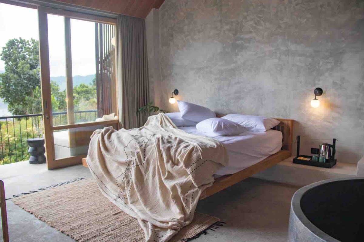 La suite de 1 dormitorio con vistas al mar de Dani Beach Villa es el refugio de lujo definitivo para personas que viajan solas, parejas y familias pequeñas. Ubicada a solo 20 m de la costa, esta suite de madera independiente de 8×9 m cuenta con un dormitorio de 7×8 m con ventanas de vidrio del suelo al techo que enmarcan vistas completas al mar, al jardín y a la piscina. En el interior, relájate en una acogedora sala de estar con sofá, escritorio y un amplio baño con ducha a ras de suelo y bañera frente al mar para una escapada verdaderamente inmersiva.