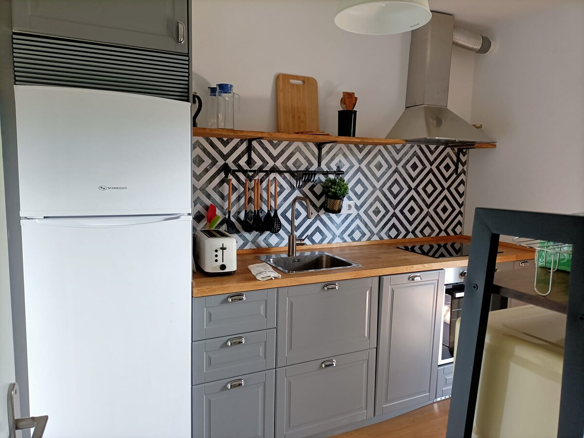 Casa/ apartamento independiente espacioso, de 60 metros, nuevo y luminoso de una sola planta. Techo de madera con dormitorio doble, baño y salón cocina orientados hacia el jardín exterior y acceso directo desde la calle. Espacio interior es abierto salón y cocina. Amplio jardín con mesa y sillas, 1 dormitorio con cama doble y un baño. Salón con sofá cama 160 y TV. Cocina americana completa con todos los electrodomésticos nuevos y equipada. Se solicita fianza de 200 € se emite recibo.