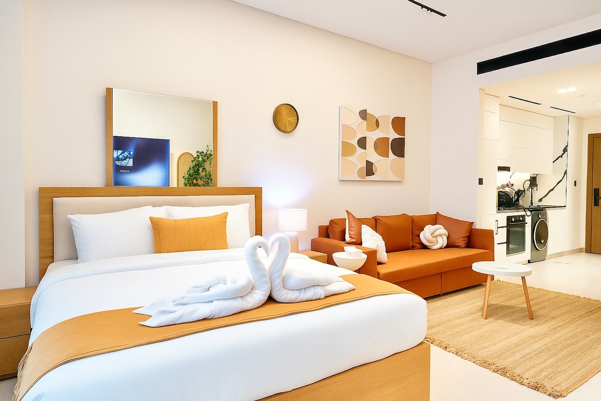 Disfruta de la elegancia y la comodidad en nuestro elegante apartamento tipo estudio con una gran terraza en el centro de Dubái. Con vistas al canal de agua de Dubái y a pocos pasos del centro comercial de Dubái y Burj Khalifa, es el punto de partida ideal para tu estancia. En el interior, disfruta de una cama tamaño king, cocina totalmente equipada, wifi gratuito, TV inteligente y aparcamiento gratuito. Tanto si viajas por negocios como por placer, nuestro apartamento combina estilo, comodidad y ubicación para una experiencia inolvidable en Dubái.