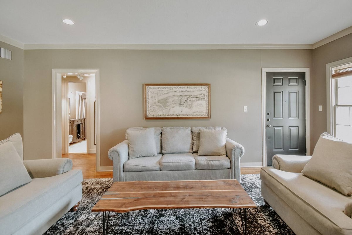 Este apartamento de 2 dormitorios y 1 baño en el primer piso está lleno de carácter y se encuentra en el distrito histórico de Bryan, a medio camino entre Texas A&M (3 millas) y el centro de Bryan. Disfruta del centro de videojuegos. También cuenta con divertidas y cómodas camas tamaño king, decoración ecléctica y un televisor de 65 pulgadas con Netflix y Amazon Prime. Con su ubicación céntrica, es fácil llegar en coche a cualquier lugar de Bryan/College Station. El apartamento incluye aparcamiento dedicado y un porche sur profundo.