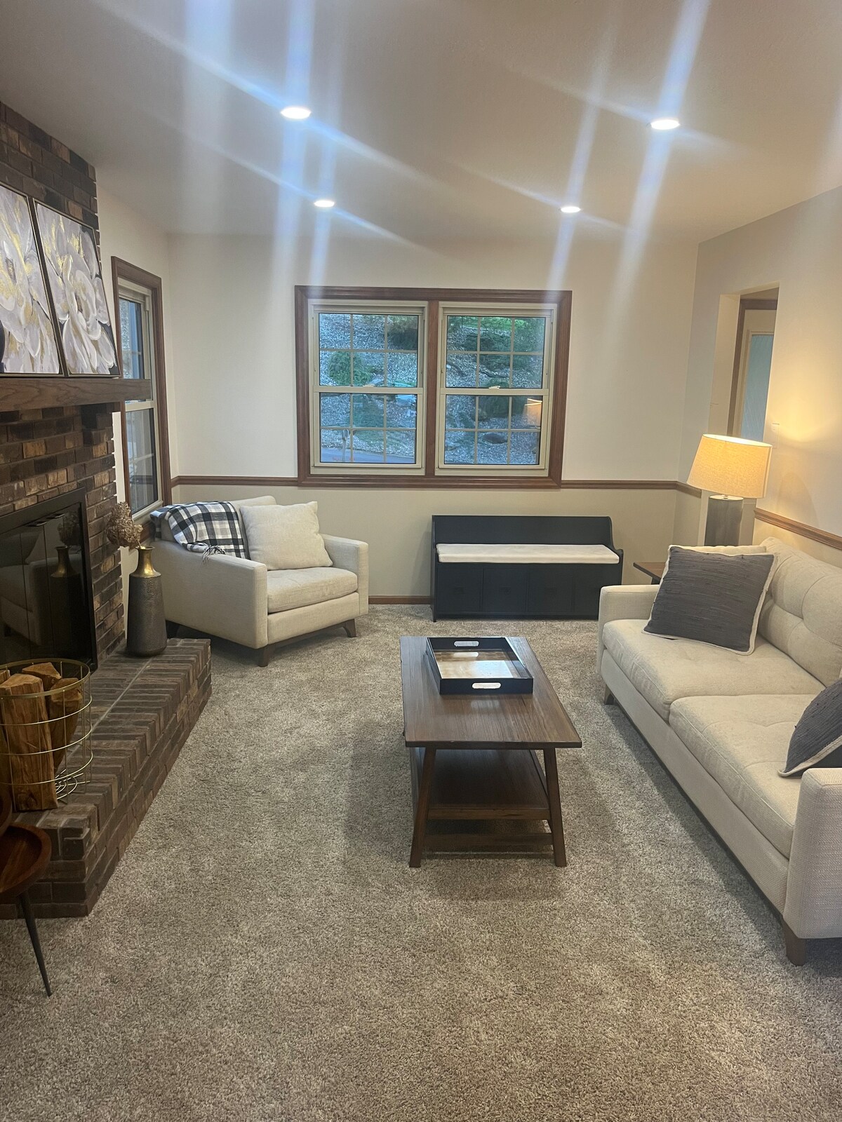 Tómate un descanso y relájate en esta tranquila casa rural de 7 hectáreas. Esta escapada de 2 dormitorios acaba de ser completamente remodelada. Da paseos por el prado o por el encantador bosque. Relájate en el gran columpio con tu libro favorito. Disfruta de los smores en la gran chimenea (leña incluida). O disfruta de la amplia sala de estar y transmite tus programas favoritos en el televisor de 72". Ambos dormitorios también tienen TV. Prepara tus propias comidas en nuestra cocina bien surtida y disfruta de tu comida dentro o fuera en la mesa de picnic o cafetería.