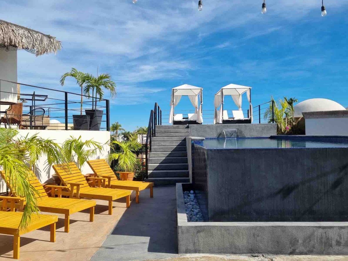 Descubre nuestro hermoso estudio de lujo de 1 cama king size y 1 baño equipado en uno de los vecindarios más seguros de cabo Tendrás unas vacaciones memorables en los Cabos. Nuestras amenidades de lujo y albercas te harán sentir como en un resort! A solo unos cuantos de la carretera principal de los Cabos que ofrece fácil movilidad. A unos cuantos pasos de Costco. Nuestra terraza equipada, escritorio para home office, cocineta y WiFi brindan la mejor de las comodidades.