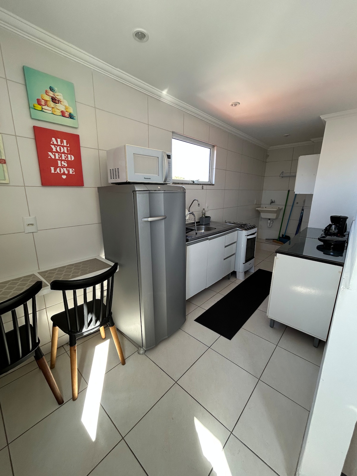 Relájese en este lugar único y tranquilo. En el espacio tenemos una cama doble, TV inteligente de 32 pulgadas, mesa con dos sillas, cocina con microondas, nevera, cafetera, licuadora, sandwichera, armario, fregadero, platos, vasos, tazas y cubiertos. Tenemos garaje y parrilla compartida.