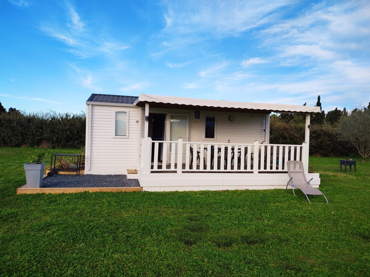 ¡Entre el mar y la montaña! A pocos minutos de las playas de Argeles, Canet, Collioure, St Cyprien. L'Olivier, casa prefabricada equipada y con aire acondicionado/calefacción. Con una gran terraza cubierta y cerrada. ¡En un entorno tranquilo, en medio de la naturaleza, pasará una estancia relajante! 2 dormitorios, un baño y una zona de cocina. Disfrutará de 2000 m2 de jardín, solo para usted y una zona de comedor a la sombra. ¡Todo en una gran propiedad de 2 hectáreas! Paseos y puntos de agua cerca a pie o en bicicleta