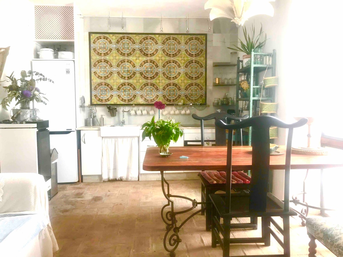 EN EL CASCO HISTÓRICO DE VEJER.AL LADO DEL TEATRO, CON PAREDES DEL ANTIGUO CONVENTO.Casa llena de carácter, acogedora y espaciosa. Casa de diseño y comfort, rehabilitada recientemente respetando sus características originales.Detalles artísticos en cada rincón, escaleras esculpidas en hierro, pared con azulejos de porcelana de 100 años, losas hidráulicas, vitral y viga antigua en el baño, pared de piedra del S XIV. Gran azotea con chillout & jazmines.Vistas al campo & pueblo. ENAMORA