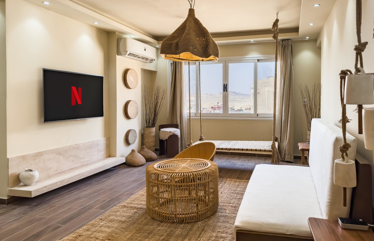 El Khan of the Pyramids, un refugio único donde el diseño artesanal se une a las maravillas antiguas. Este sereno apartamento está ubicado en El Haram y ofrece vistas directas a las pirámides desde tu cama o jacuzzi. Cada rincón está lleno de texturas terrosas, piezas seleccionadas y luz natural, diseñadas para una vida lenta, noches tranquilas y mañanas mágicas con una vista verdaderamente inolvidable. Tanto si eres una pareja, un viajero solitario o un alma creativa que busca inspiración, este Khan es tu refugio en Guiza.