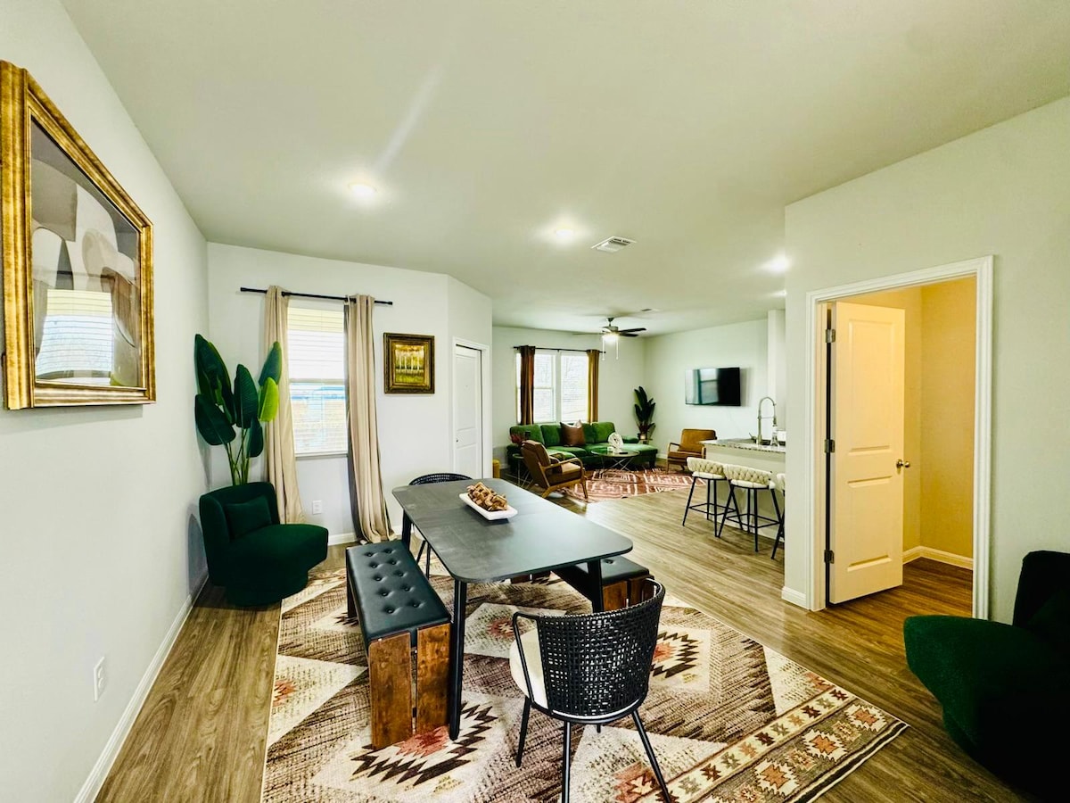 Bienvenido a este relajante hogar lejos de casa, remodelado con mucho gusto, un refugio de concepto abierto en el centro de Texas. Una cocina totalmente amueblada para comer y hornear está a tu disposición. El espacio al aire libre es ideal para asar a la parrilla y relajarse en el patio sombreado situado en un patio trasero arbolado. Hay disponibles varios juegos al aire libre. Dos dormitorios tienen camas tamaño queen, el otro tiene 2 camas individuales, un sofá cama Ashley Furniture con colchón tamaño queen de espuma viscoelástica. La suite principal tiene un espacio de trabajo dedicado.
