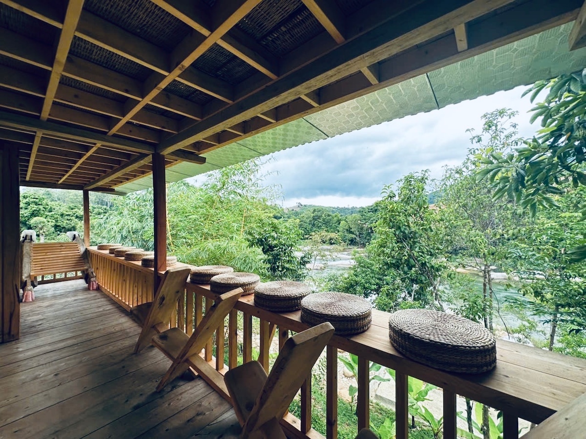 Nhà sàn view suối ở Hòn Bà Valley không đặc biệt vì cầu kỳ, mà đặc biệt vì đúng mạch tự nhiên, đúng tinh thần sống chậm của người xưa, thứ mà người hiện đại đang tìm lại, ở cùng thiên nhiên theo cách nguyên bản và yên tĩnh. Nhà sàn được nâng cao khỏi mặt đất, đón gió, khô ráo mà vẫn gần rừng. Từ căn nhà, tầm nhìn mở ra dòng suối, không che chắn. Sáng sớm thấy nước, đá, rêu và làn sương mỏng trôi chậm. Ban đêm, ánh đèn vàng vừa đủ, tiếng côn trùng hòa cùng mùi gỗ và mùi rừng ẩm.