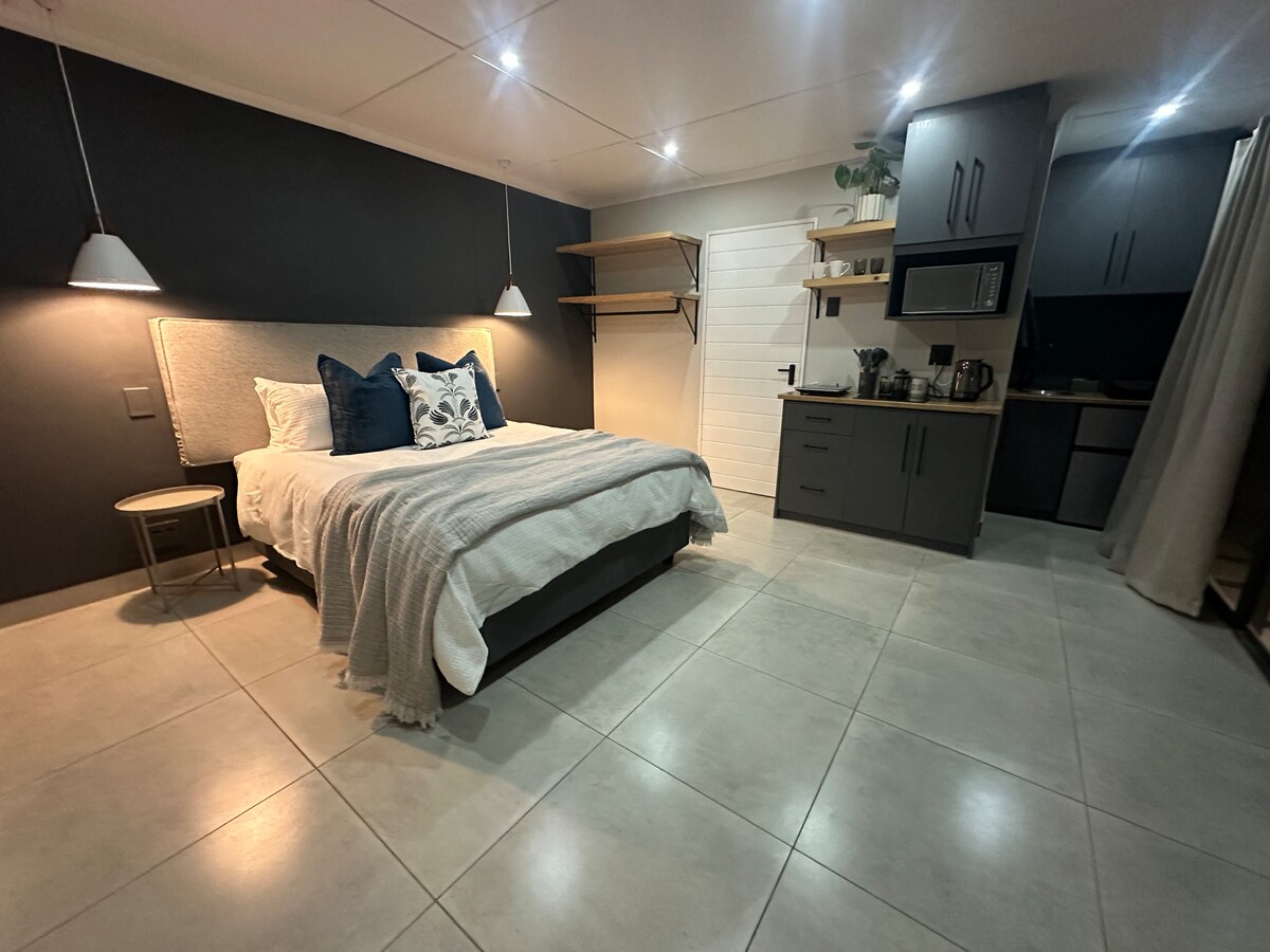 Moderno apartamento de 1 dormitorio en Carters Glen, ideal para negocios o placer. Incluye una cama tamaño «king» para parejas o 2 camas individuales para compañeros (con manta eléctrica en invierno), TV inteligente, calentador de gas y inversor para wifi, TV y carga de teléfono durante cortes de energía. Un tanque JoJo de 2400L garantiza el agua de respaldo. Disfruta de un patio privado con braai, acceso a una piscina, aparcamiento cubierto y wifi gratuito. Zona segura y tranquila: ¡tu hogar lejos de casa en Kimberley!