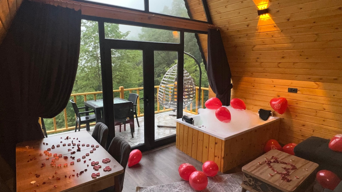 Şana Bungalovumuz, konaklamalarınızı en konforlu hale getirmek için tasarlandı. Dublex olarak inşa edilen bungalovumuzun giriş katında rahat bir oturma alanı ve sedir bulunuyor. Dış balkonda ise jakuzi keyfi sizi bekliyor. İçeride yer alan banyo ve WC ise konforunuz için düşünülmüş. Üst katta bir adet çift kişilik yatak, alt katta ise bir adet çift kişilik yatakla konaklama ihtiyaçlarınıza cevap veriyoruz. Restoranımız mevcuttur ücretli olarak kahvaltı ve akşam yemeği alabilirsiniz...