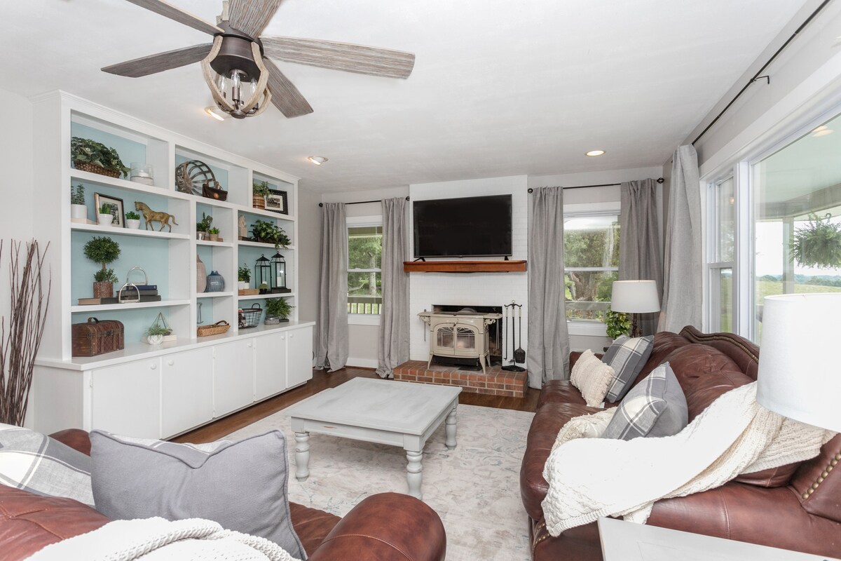 Esta casa de temática ecuestre tiene capacidad para 7 personas en total. La casa y su enorme porche trasero ofrecen hermosas vistas de nuestra granja de 50 acres con una escena tranquila de pastos y colinas ondulantes. La casa incluye un dormitorio con cama tamaño king, un dormitorio con cama tamaño queen, un dormitorio con litera con 3 camas individuales y escritorio, una cocina completa, 2 baños bellamente renovados (en 2024) y un gran porche trasero con zonas para relajarse y una parrilla de gas. ¡Esperamos que lo disfrutes! Danielle