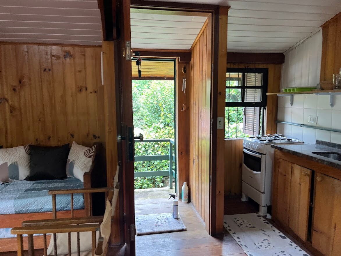 Hermosa cabaña, completa para hasta 2 huéspedes, 28 m², entrada independiente por el jardín, terraza con vista privilegiada al bosque nativo, bañera de hidromasaje doble moderna, despensa con fregadero, cocina, mesa y silla y utensilios básicos de cocina. Decoración con el tema "Naturaleza", cama queen size, 4 almohadas, ropa de cama y toallas, minibar, smart TV Samsung, chimenea eléctrica con efecto fuego, baño privado, espacio para colgar ropa y espejo de cuerpo entero.