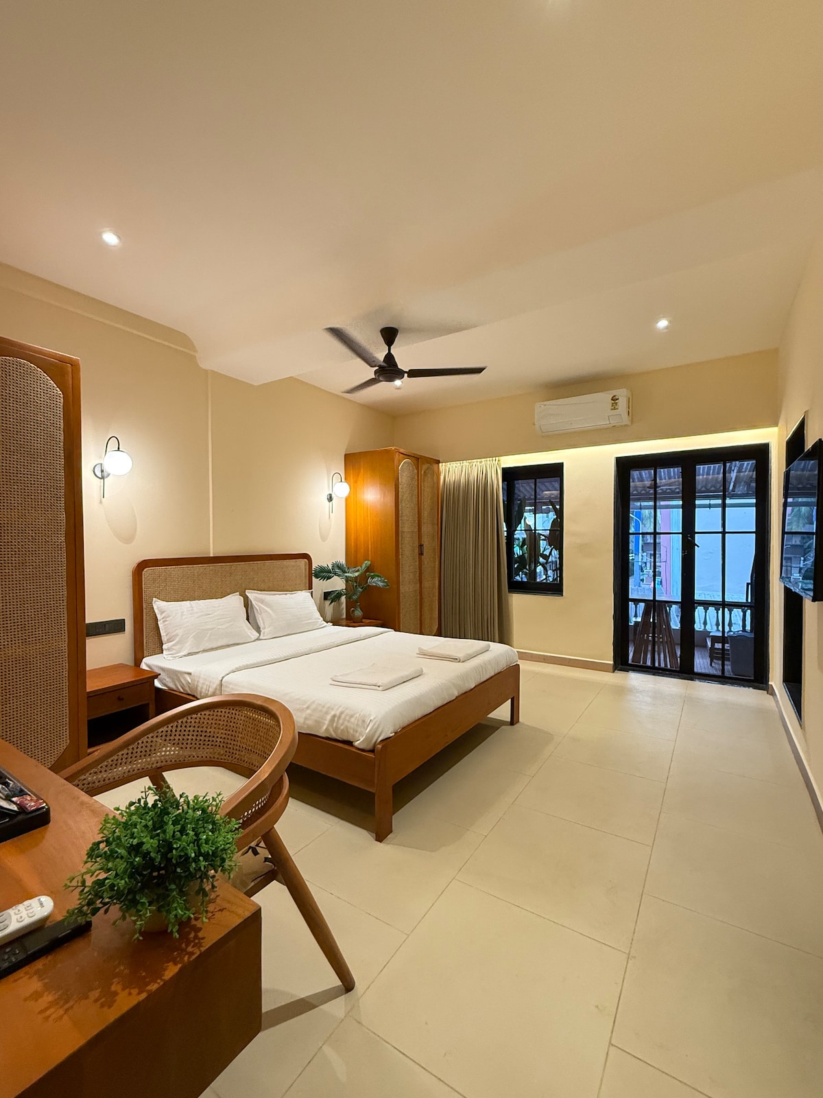 Amplia habitación doble Deluxe con balcón y cama Queen. Equipada con aire acondicionado, TV y una mesa de estudio. En la playa de Agonda, la playa está a un minuto a pie de la habitación. Tenemos un restaurante de cocina múltiple llamado Manveer 's Kitchen donde podrás disfrutar de comida y bebida.