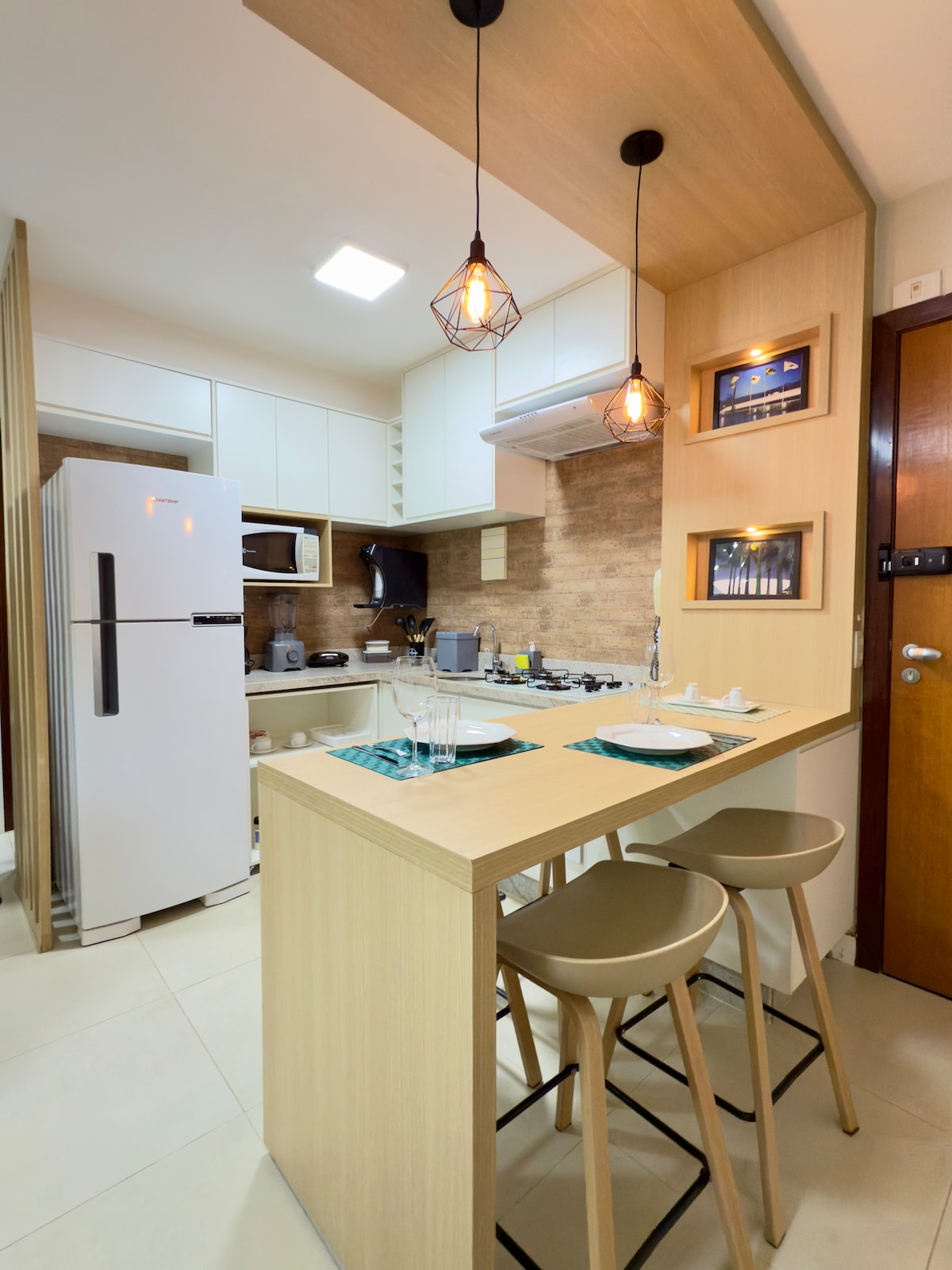 El apartamento es nuevo y está bien amueblado, 1 suite, sala con sofá cama doble y escritorio cocina con heladera frost free, estufa, microondas, cafetera, filtro y utensilios. Cuenta con 2 aparatos de aire acondicionado split, 2 televisores Led 32 y ropa de cama y baño completa