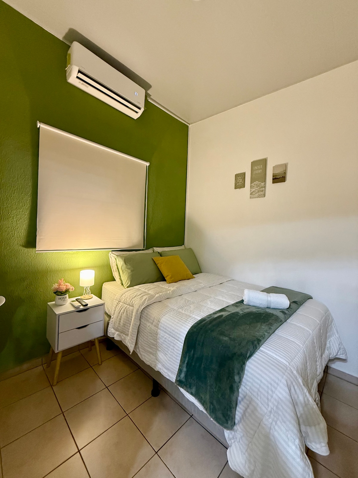 Villa de Vientos, en el corazón de Apaneca, cautiva a primera vista con su primaveral jardín interior en el que convergen tres apartamentos. Independientes, equipados al detalle y con baño propio, todos ofrecen confort, privacidad y lo necesario para sintonizar con la naturaleza, la tranquilidad del pueblo y tener una estadía memorable. El Apartamento 1, con un dormitorio y un espacio multifuncional con cocina y comedor, acomoda a 4 personas, facilita un sofá cama en sala.