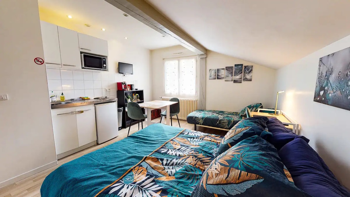 Fácil acceso, estudio totalmente reformado en la planta baja de nuestra casa, bienvenido a un pequeño lugar donde es agradable relajarse, trabajar, visitar y estar solo o en pareja. El estudio consta de una cama con colchón nuevo para 2 personas (ropa de cama y toallas incluidas) Una cocina totalmente equipada Un baño sucio (secador de pelo y alisador incluidos) Un pequeño jardín Llegada autónoma (caja de llaves) a partir de las 15:00 h. Será un placer conocerte