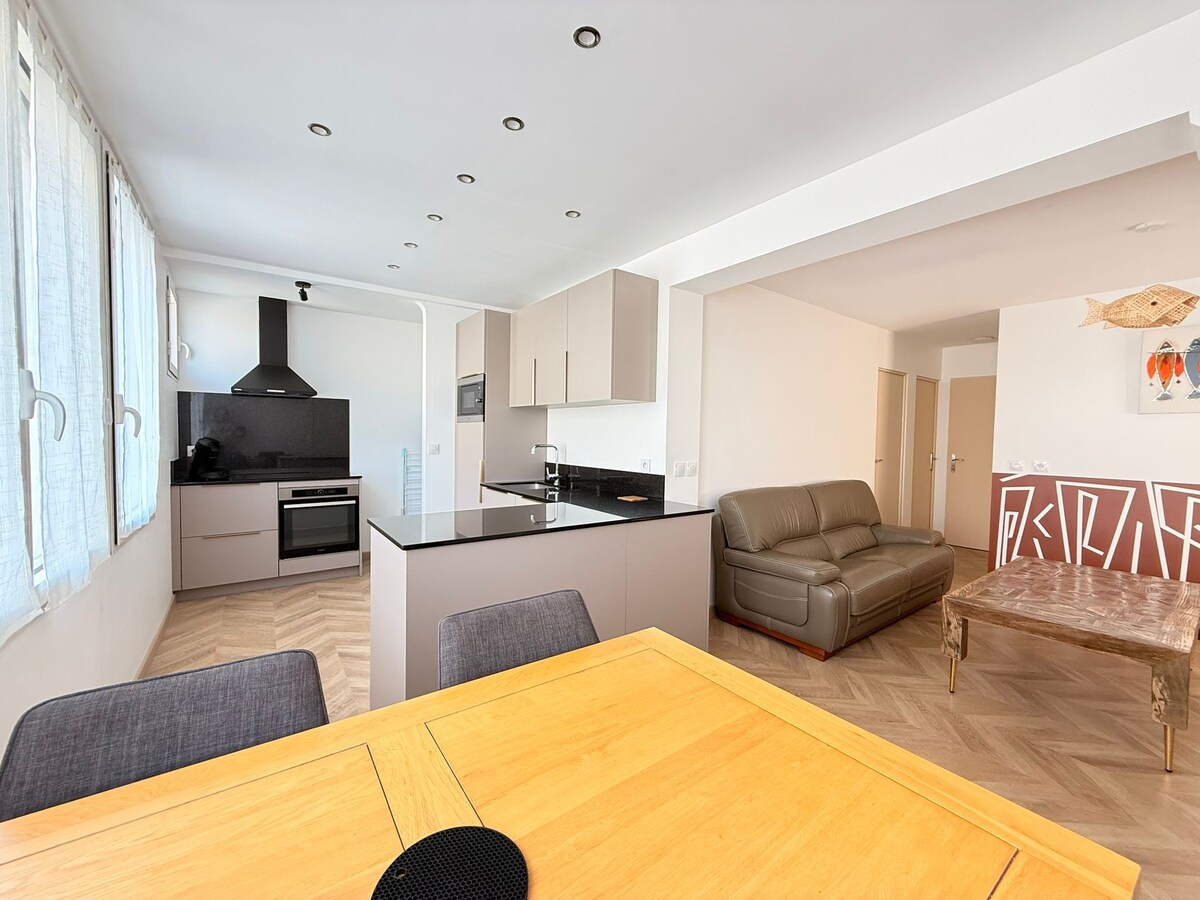 alojamiento reformado situado en el 5.º piso(38 m²+10 m²terraza)- 2 ascensores- aparcamiento privado en el lugar (altura 1,90 m máx.)-todo confort -vista panorámica del mar desde la terraza cubierta - Sin vecinos - Acceso directo a la playa - 1 dormitorio cama doble 140 - 1 zona de dormitorio cama 140 - aire acondicionado - cocina equipada nueva placa de inducción de 4 fuegos, horno de calor giratorio - microondas - lavavajillas, lavadora secadora - TV conectada - Sábanas, toallas proporcionadas, wifi fibra-