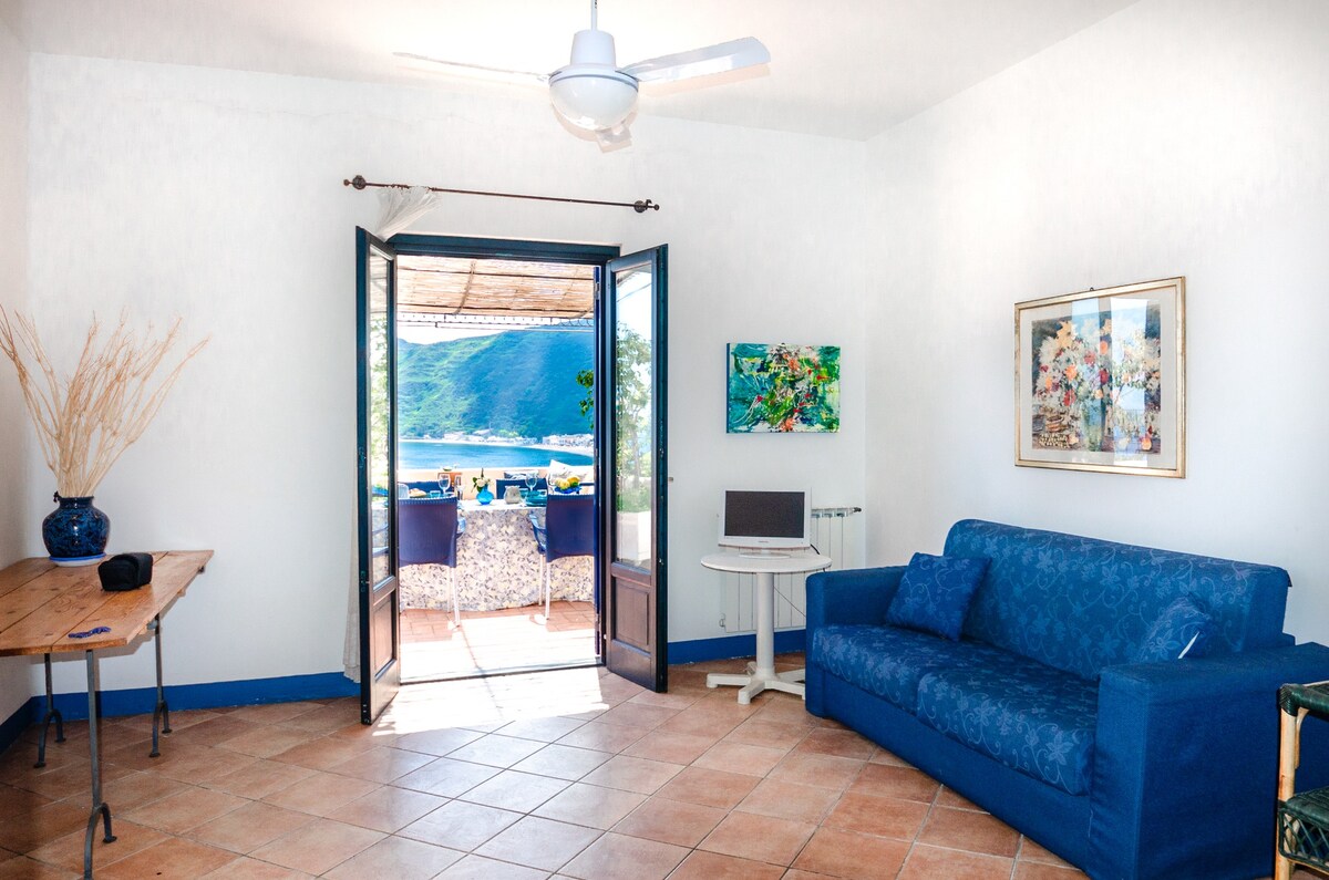 El apartamento forma parte de la casa donde vive la propietaria única y consta de un gran dormitorio con una cama doble divisible, aire acondicionado, un vestidor, un baño completo con ducha, una cocina equipada con todo lo necesario, sofá y televisión. Además, dispone de una gran terraza con vistas al mar, con una parte cubierta para comer y relajarse y unas maravillosas vistas de Panarea y Stromboli. Una escalera privada conduce a la preciosa cala de abajo, con un mar espectacular.