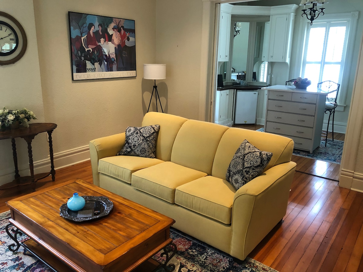 The guesthouse seamlessly blends modern amenities with historic charm in a cozy, compact space. The antique claw foot tub/shower combo offers a charming, yet snug, spot for a relaxing soak—true to its historic roots, the bathroom could be best described as a quaint water closet. After a day of exploring unwind in the patio. Play a favorite record, and savor your coffee while daydreaming about new experiences. Despite its small size, it provides all the modern comforts you need.