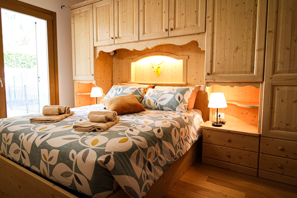 Una pequeña joya con vista panorámica situada en el carril bici Dolomites. Colindante con los diferentes puntos de recogida y tiendas Este apartamento de unos 40 metros cuadrados ofrece todo lo necesario para una estancia de hasta 4 personas. El dormitorio doble con cama tamaño king El baño con la ducha muy grande El salón con cocina americana, mesa comedor y las dos sumas muy cómodas que completan el mobiliario El acogedor y funcional apartamento ideal para unas relajantes vacaciones de verano e invierno
