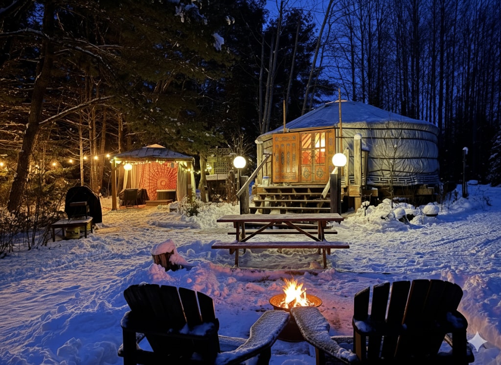 Reconecta con la naturaleza en Tall Pines Nature Retreats, donde una lujosa yurta pintada a mano con una bañera de inmersión interior ofrece comodidad y calma en un santuario forestal en una granja hortícola boutique. Contempla las estrellas junto al fuego, relájate bajo el arte del techo o explora una orilla mágica. Rema, nada o flota con el uso estacional de canoas, kayaks, tablas de surf de remo o raquetas de nieve. Esta es una granja de agroturismo registrada que ofrece un retiro de naturaleza y bienestar, no un alquiler típico para estancias cortas.