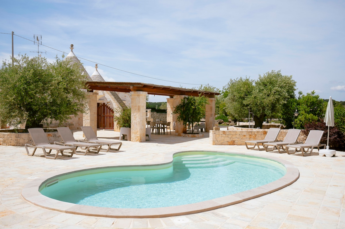 Este espacio único, tallado dentro de los trullos tradicionales, tiene su propio encanto y te permite experimentar el verdadero espíritu del valle de Itria. Se entra a través de una antigua pérgola de fresas y uvas. La cocina y el baño están ubicados en las alcobas, mientras que las zonas de comedor y dormitorio están ubicadas en un trullo sarraceno y un trullo de cono alto. El patio privado y la piscina infinita cercana ofrecen vistas al valle y al horizonte de Ceglie Messapica.